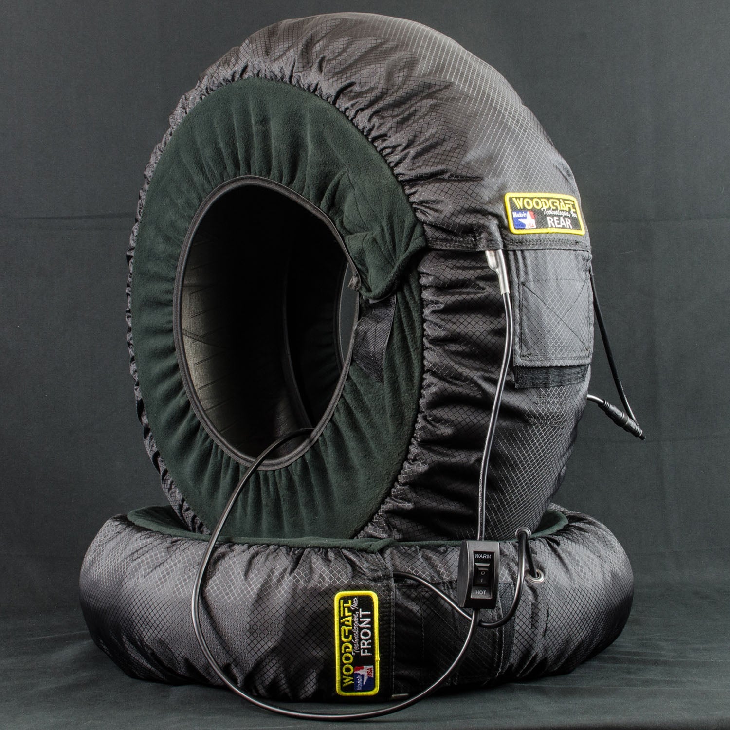Woodcraft Gen III Dual Temperature tire warmers with carrying case included. Dual-zone heating with high and low settings lets you control tire temperature precisely. Quick-disconnect power cords and fleece-lined construction protect your tires.