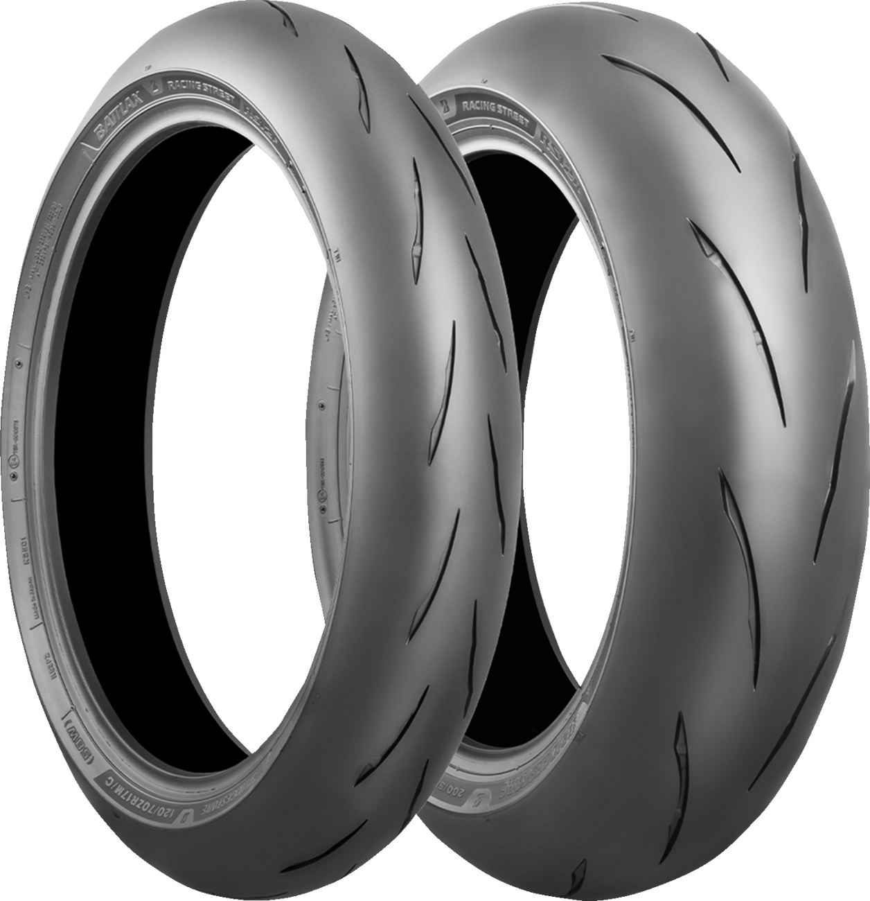 The RS12 is as close to a race slick as you can get in a DOT tire. It uses Bridgestone's latest NanoPro-Tech compound for maximum grip at operating temperature and a carcass design derived from their MotoGP program. The tire needs proper warming to perform — it's designed for track use with tire warmers.